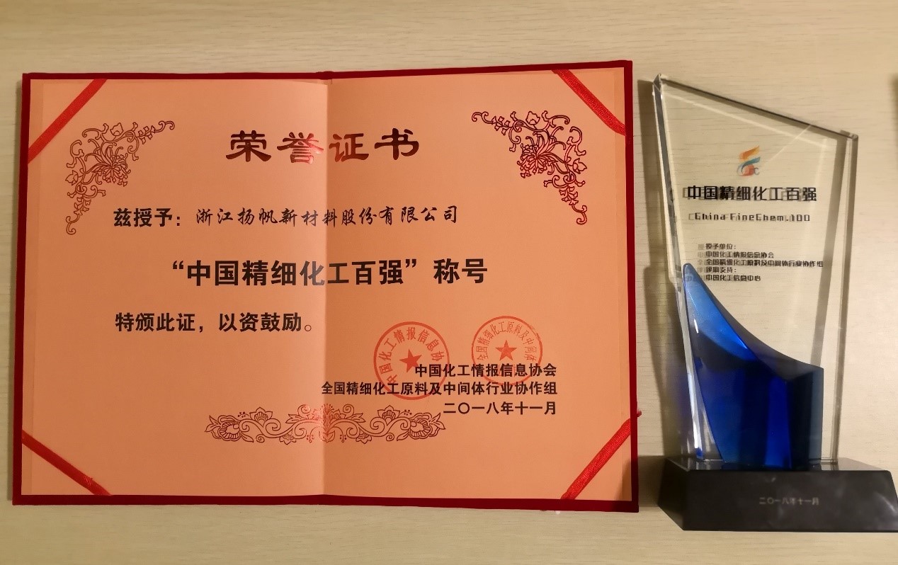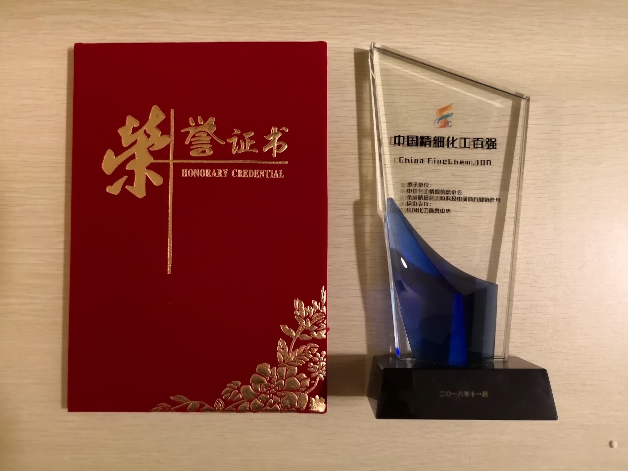 2018年11月8日,在山東鄒城舉辦的2018中國(guó)精細(xì)化工行業(yè)發(fā)展(鄒城)峰會(huì)暨中國(guó)精細(xì)化工百?gòu)?qiáng)發(fā)布會(huì)上,我司榮獲了“中國(guó)精細(xì)化工百?gòu)?qiáng)”稱號(hào)。