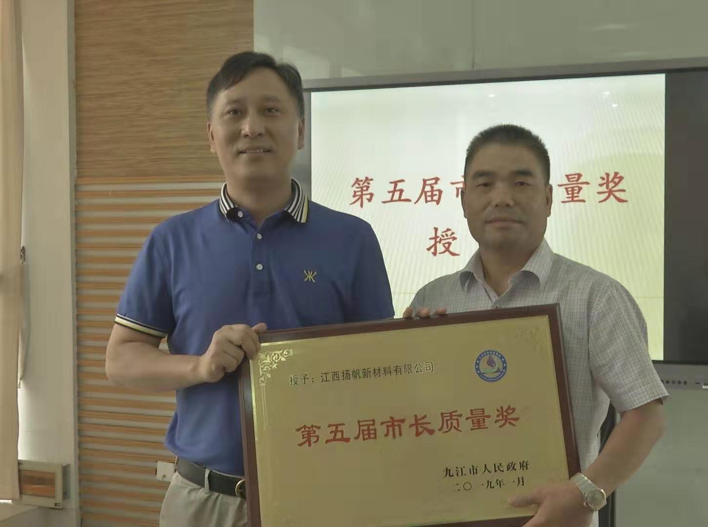 8月26日,九江市、彭澤縣兩級(jí)市場(chǎng)監(jiān)督管理工作人員專(zhuān)程來(lái)到江西揚(yáng)帆,為企業(yè)頒發(fā)2018年第五屆“市長(zhǎng)質(zhì)量獎(jiǎng)”。我公司是2018年度彭澤縣唯一一家“市長(zhǎng)質(zhì)量獎(jiǎng)”獲獎(jiǎng)單位。