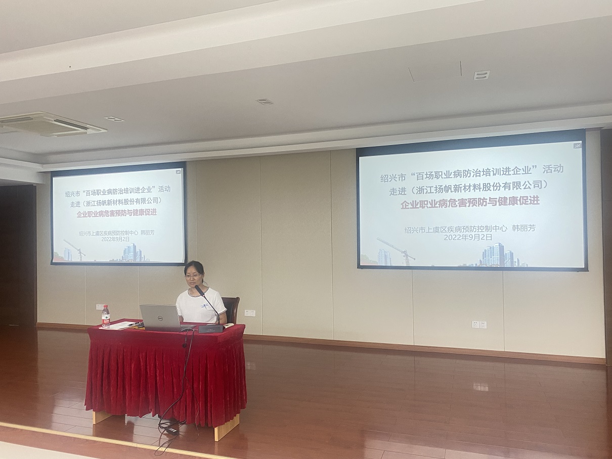 9月3日下午,紹興市“百場職業病防治培訓進企業”活動走進浙江揚帆新材料股份有限公司,以“企業職業病危害預防與健康促進”為主題開展宣講,旨在進一步豐富公司“職工安全文化”內涵,提高廣大職工個人防護技能,增強職工的安全感和幸福感,公司三十余名員工參加此次主題宣講活動。