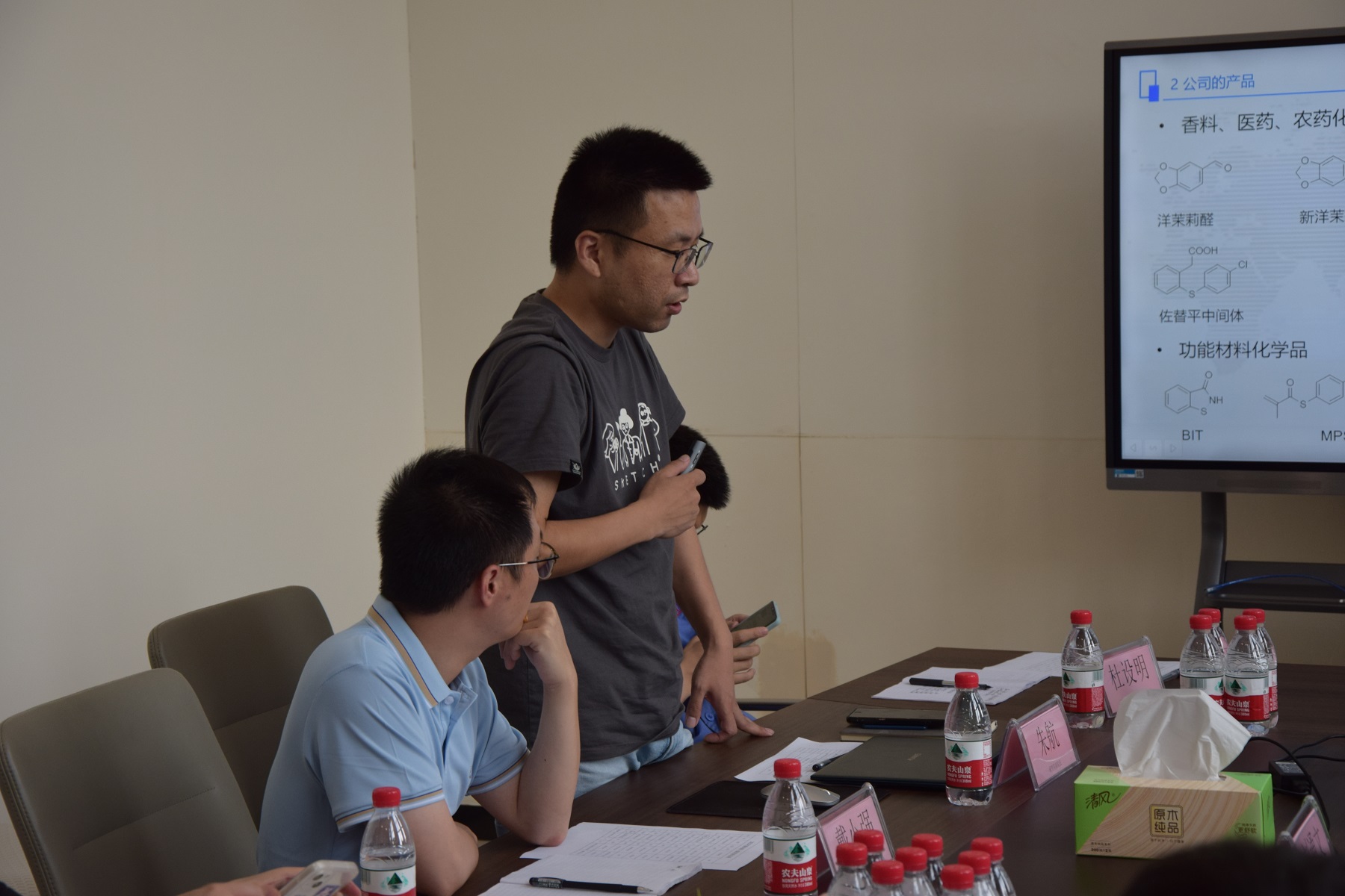 硫磷研究院副院長(zhǎng)戴小強(qiáng)帶領(lǐng)新員工熟悉工作環(huán)境,邊走邊介紹實(shí)驗(yàn)室分布及各個(gè)項(xiàng)目的發(fā)展情況。